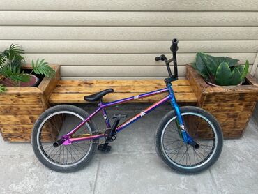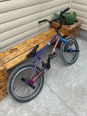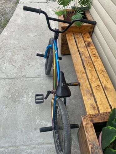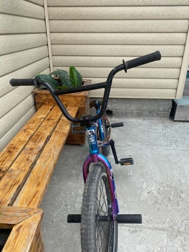 Срочно продаю BMX велосипед с прочной рамой, окрашенной в переливающийся цвет от синего к фиолетовому. Руль черного цвета обеспечивает надежный хват и контроль. Оснащен пегами для выполнения трюков. Подходит для катания в скейт-парках и на улицах.торг имеется