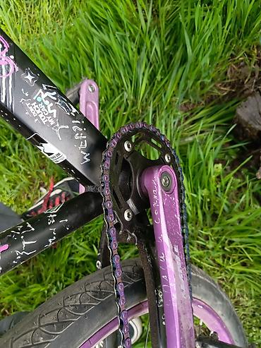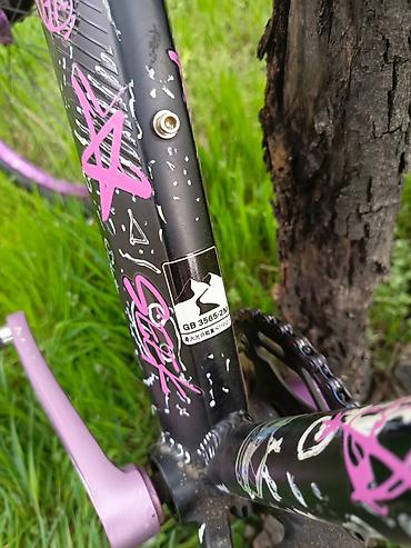 - Рама: хардтейл из сплава, укороченная геометрия для стрита/джампа, верхняя труба занижена. Яркий кастомный окрас со стикерами.