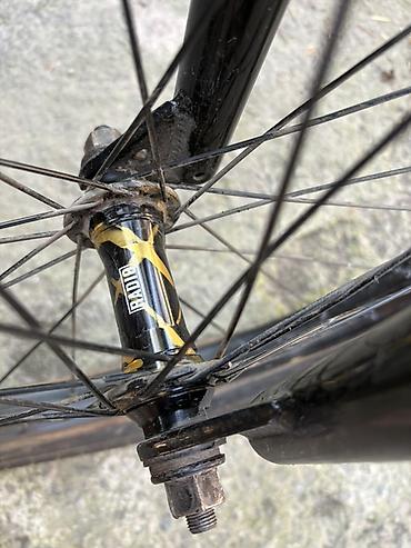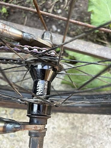 - Передняя втулка на промах RADIO (на фото с логотипом), под гайки, двустенные обода, черные спицы.