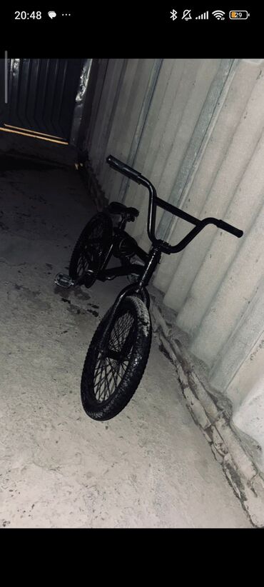 BMX велосипед для трюков и городского катания. Характеристики: - Рама из стали, компоновка с нижней косой трубой и дополнительными усилителями. - Высокий руль типа 2‑piece с широким вылетом; грипс...