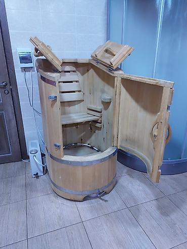 - Конструкция: вертикальная бочка с распашной дверцей, верхними створками для головы, удобными ручками снаружи. Внутри – сиденье с регулируемой спинкой, подставка/полочка для ног, подстаканник/ароматический стакан.