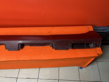 Боковая юбка красного цвета, предназначенная для установки на автомобиль. Имеет изогнутую форму и крепежные элементы на внутренней стороне, что обеспечивает надежное прилегание к кузову. Этот элемент кузова помогает улучшить аэродинамику и придает автомобилю более спортивный вид. Подходит для замены поврежденных деталей или для тюнинга.