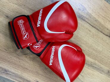 - Hayabusa: красные перчатки с белыми дугообразными элементами и логотипом.
