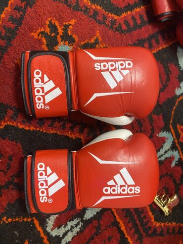 - Перчатки adidas, 10 oz — красно-белые, липучка. Мягкая ударная зона, усиленная защита запястья, вентиляционные вставки, классическая посадка.
