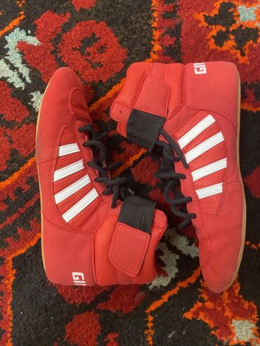 - Боксерские кросс/ботинки (кеды для ринга) красные с белыми полосками — высокая шнуровка, дополнительная фиксация ремнем на липучке, облегченная подошва с хорошим сцеплением с рингом, гибкий корпус для быстрых перемещений.