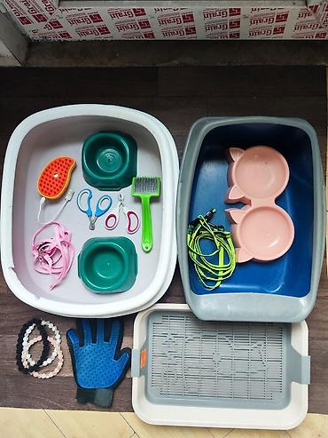 Продаётся кошачий инвентарь всё новое в отличном состоянии переноска новая 1000 сом латки белая 45х35см 500сом синьяя 45х30см 400сом и 300сом с сеткой паравая щётка 300сом миски по 50сом когтирезки по 200сом по адресу 5-микраён