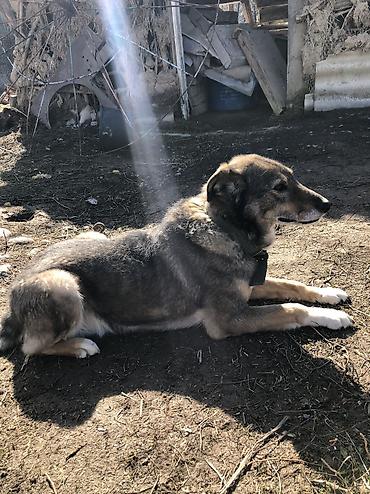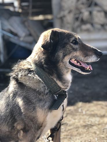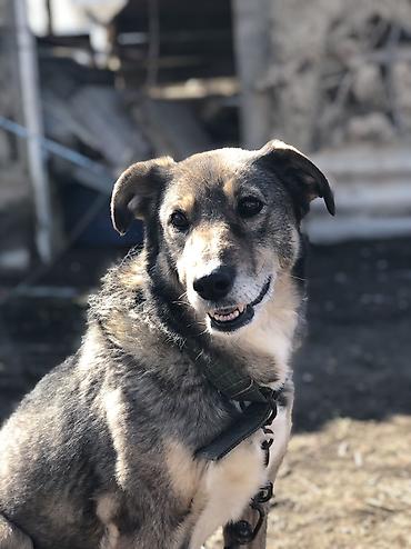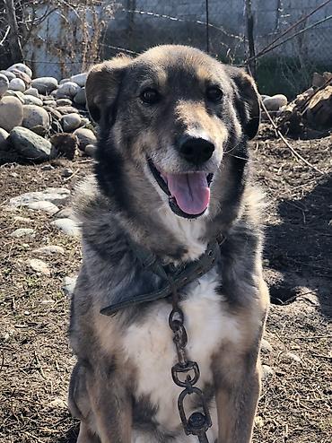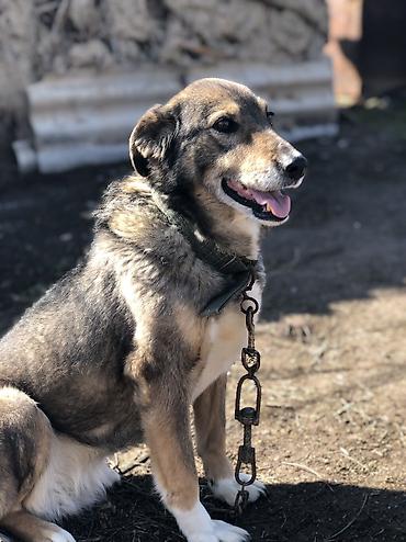 Собака средних/крупных размеров с плотной двойной шерстью серо-рыжего окраса и белыми отметинами на груди и лапах. Пропорциональное телосложение, полустоячие уши, тёмные выразительные глаза. На фото — в прочном тканевом ошейнике и на металлической цепи.