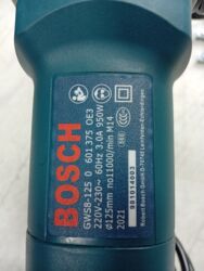 Угловая шлифмашина (болгарка) Bosch GWS 8-125. Характеристики по шильдику: - Модель: GWS 8-125 (0 601 375 0E3) - Питание: 220–230 В, 60 Гц - Мощность: 950 Вт - Диаметр круга: 125 мм - Обороты без ...