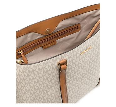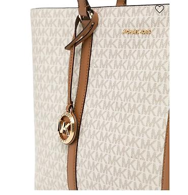 - Материал: фирменный бежевый канвас с монограммой MK, отделка и ручки из гладкой кожи карамельного оттенка.