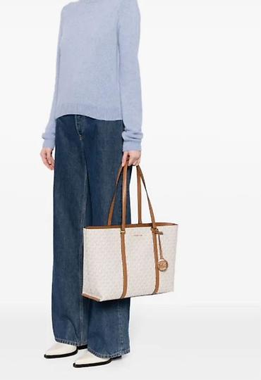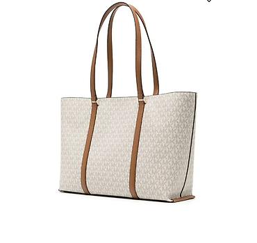 - Дизайн: светлый канвас с фирменным монограммным принтом MK по всей поверхности; вертикальные кожаные вставки и ручки карамельно-коричневого цвета; подвеска-брелок с логотипом MK в золотистом тоне; металлический логотип Michael Kors спереди.