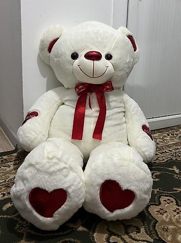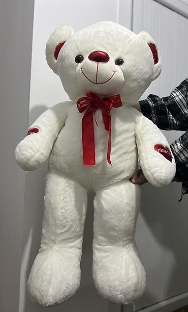 Большой плюшевый медведь белого цвета с красными акцентами.