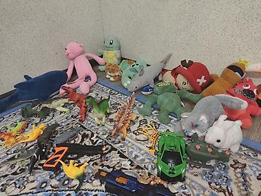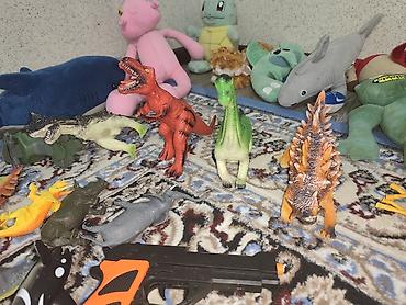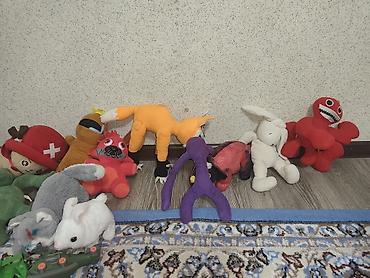 - Мягкие игрушки: акулы (большая синяя и серая), черепашка, кролики белый и серый, котик, лягушка, динозавры-плюш, персонажи из популярных игр/мультиков (в т.ч. красный, оранжевый, фиолетовый и розовый монстрики, грибной герой, медвежонок и др.).