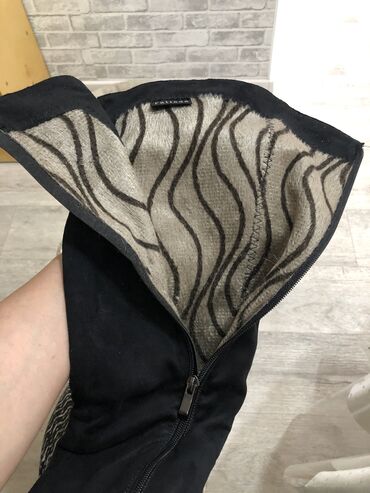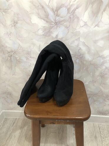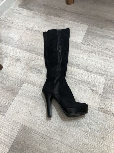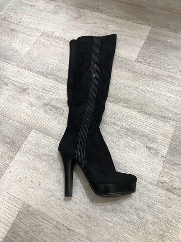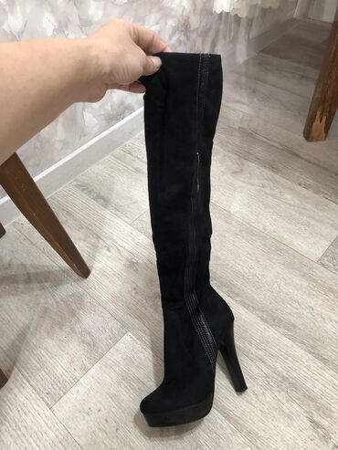 Женские сапоги ботфорты . Замша . Цвет чёрный . Состояние отличное . Один раз одевала . Как новые . Размер 38 . Высота каблука 12 см . Высота платформы 2 см .