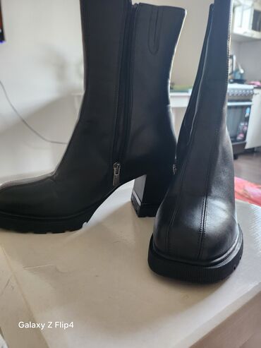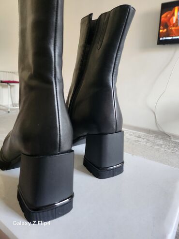 Женские полусапожки из натуральной кожи на устойчивом каблуке в отличном состоянии. - Цвет: чёрный, матовый. - Высота каблука - 7 см., средний, прямоугольный, удобный и устойчивый. - Застёжка: бок...