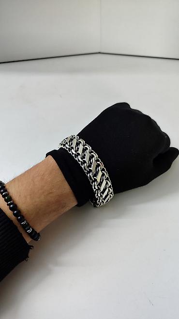 - Дизайн: брутальный, с чередованием глянцевых вставок и более темных звеньев, сочетается с часами и браслетами из камня.