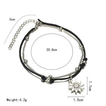 Этот оригинальный браслет сочетает в себе прочный черный шнур, утончённую серебристую цепочку и подвеску в виде солнца — символа света, силы и уверенности. Легкий блеск металлических бусин придаёт украшению характер и универсальность.