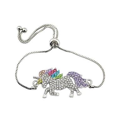 Изящный серебристый браслет с фигуркой единорога, усыпанного сверкающими камнями и радужными акцентами на гриве и хвосте.