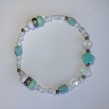 Собран вручную из бусин в нежных мятно-белых оттенках.