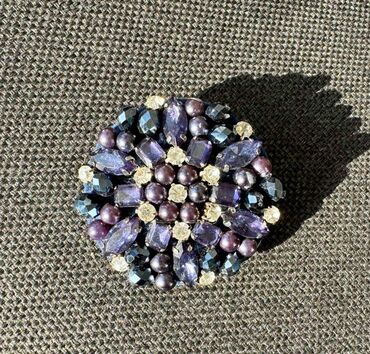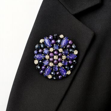 Эффектная брошь насыщенного фиолетово-синего цвета с блестящими камнями и декоративным исполнением. Смотрится дорого и элегантно. Подходит для пиджака, пальто, платья, шарфа или сумки.