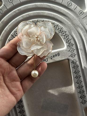 - Элегантная брошь в форме крупного цветка с многослойными лепестками полупрозрачного перламутрового оттенка.