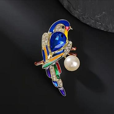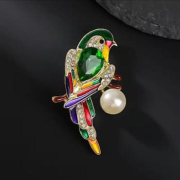 - Яркий дизайн в виде птицы: крупный каплевидный камень в центре (зелёный или синий), многоцветная эмаль, инкрустация прозрачными стразами.
