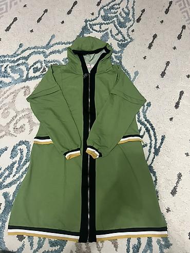 - Удлиненная куртка-худи на молнии с капюшоном (хаки). Контрастная центральная планка и молния, манжеты и низ отделаны полосами в черно-бело-горчичном цвете.
