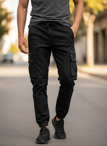 - Карманы: боковые прорезные + накладные карго на обеих штанинах