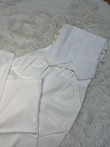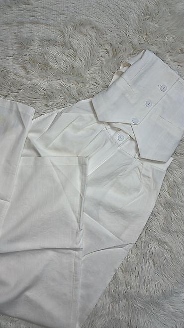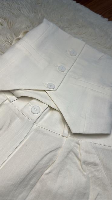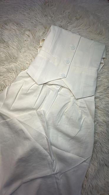 Брюки женские белые с высокой посадкой и широким поясом, застегивающимся на три пуговицы. Изготовлены из легкой ткани, подходящей для теплой погоды. Классический стиль, который можно носить как с повседневной, так и с более формальной одеждой.