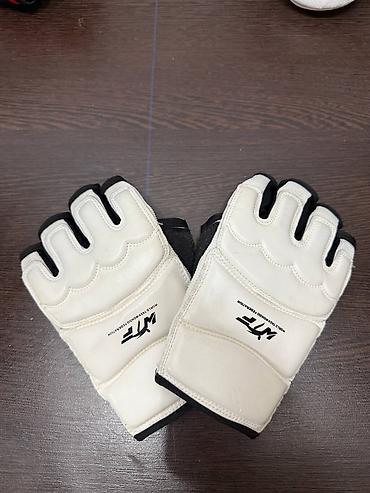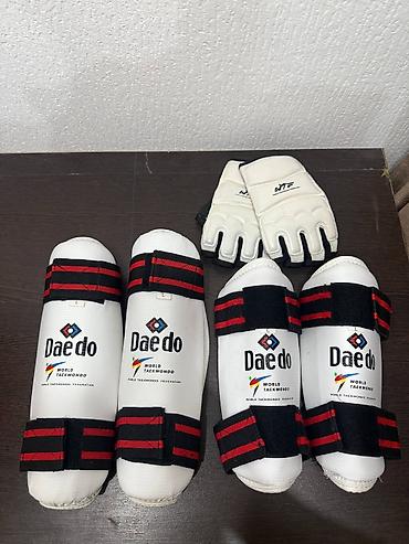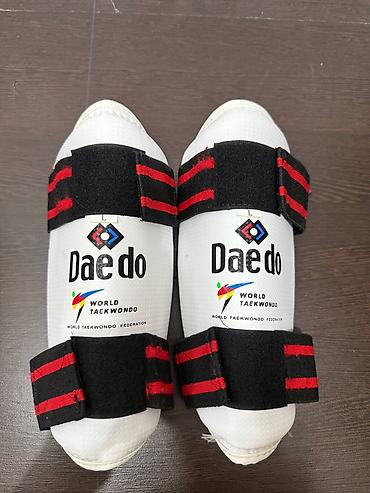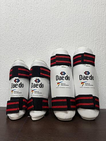 Комплект экипировки для тхэквондо (WTF/World Taekwondo): Состав: - Шлем Adidas белый, с вентиляционными отверстиями, фиксируется ремешками. - Накладки на голени Daedo WTF — пара, с эластичными рем...