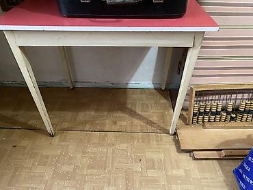 - Лёгкий кухонный/рабочий стол с ламинированной столешницей красного цвета и прямыми ножками — компактный и устойчивый, подойдёт для кухни, мастерской или дачи.
