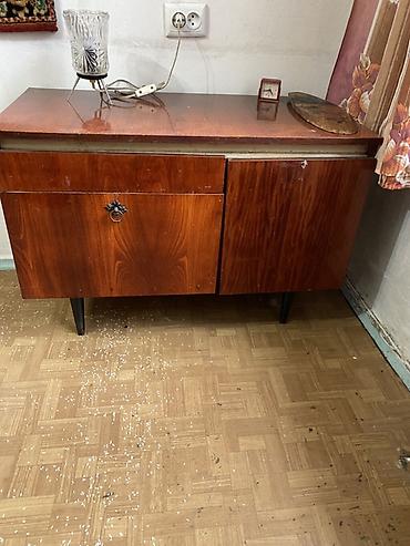 - Буфет/тумба на высоких ножках, шпонированное дерево, две секции: левая с выдвижным ящиком и распашной дверцей, правая — отделение с дверцей. Столешница ровная, удобна под технику или декор. Металлическая фурнитура, классический рисунок шпона.