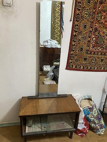 - Невысокая тумба-журнальный столик с настенным прямоугольным зеркалом. Тумба с открывающейся стеклянной фасадной стенкой (витрина) для хранения газет, книг, посуды. Зеркало в полный рост, крепится на планку.