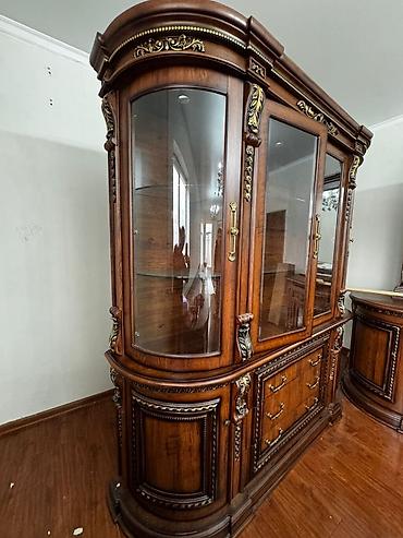 Кухонный/столовый буфет с витриной из темного шпона дерева. - Конструкция: нижний модуль с четырьмя дверцами и выдвижными секциями; верхняя витрина с раздвижными стеклянными дверцами и двумя стекл...