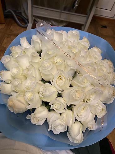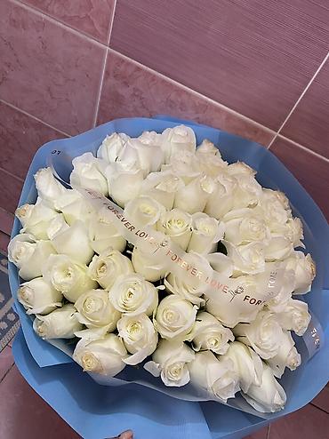 - Состав: крупные белые розы классической формы (около 51 шт. по фото), плотные бутоны.