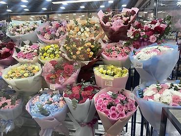 На фото видны ценники отдельных букетов:
