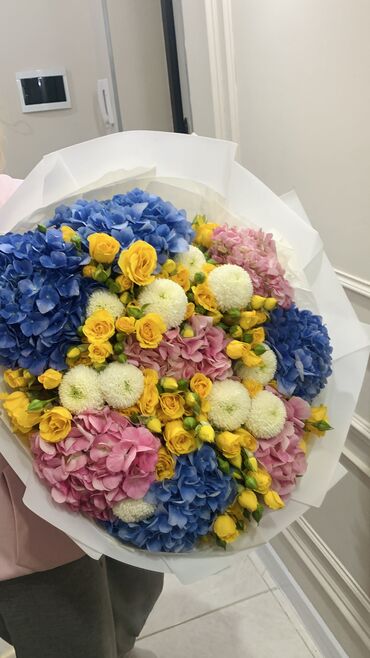 Эта эффектная композиция притягивает взгляд гармоничным сочетанием цветов и фактур. В букете используются пышные гортензии голубых и розовых оттенков, солнечные желтые кустовые розы и аккуратные белые хризантемы-помпоны. Контраст нежных пастельных тонов и сочного желтого делает букет живым, свежим и по-настоящему праздничным.