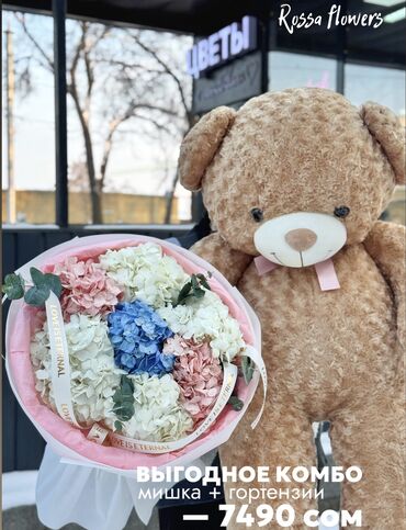 Плюшевая игрушка коала и букет гортензий в розовой упаковке (микс белого, голубого, розового, синего) с эвкалиптом и лентами.