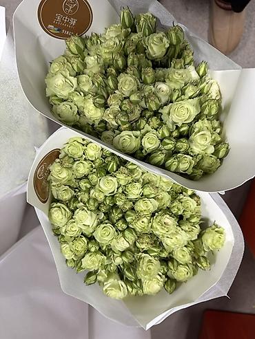 3) Светло-зеленые кустовые розы с плотными бутонами.
