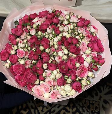 Букеты из свежих цветов 1) Классический букет из нежно‑розовых роз - Плотная шапка из роз с двуцветным оттенком: кремовые лепестки с розовыми центрами - Оформление: многослойная матовая упаковка в...