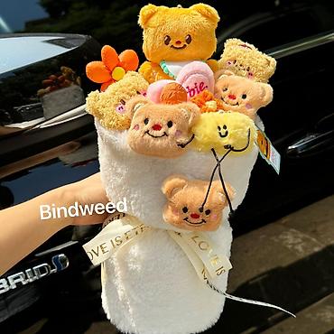 - Наполнение: множество небольших плюшевых фигурок разной формы и оттенков, аккуратно закрепленных внутри «корзинки»-букета.