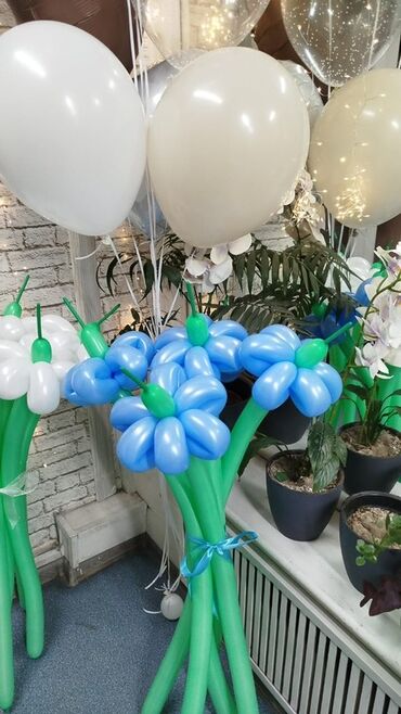 Букет из воздушных шаров в виде цветов. Включает в себя белые и голубые ромашки с зелеными стеблями и листьями, созданные из воздушных шаров. Отличный вариант для украшения праздника или в качестве оригинального подарка.
