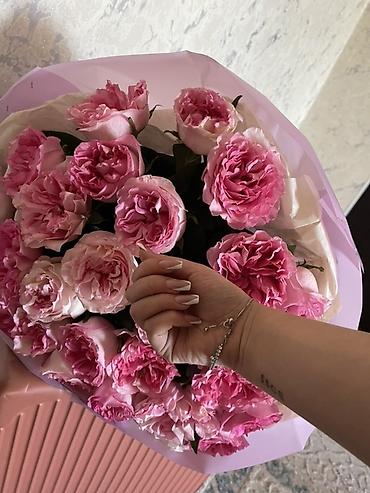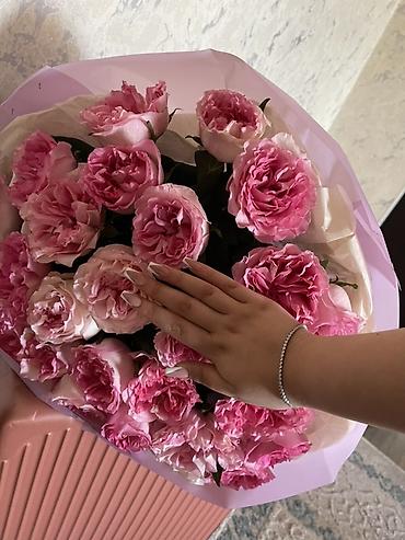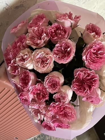 - Состав: пионовидные розы насыщенных и нежно-розовых оттенков, плотные махровые бутоны с выразительной гофрировкой лепестков.