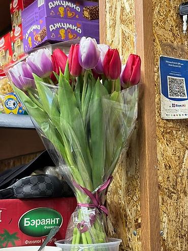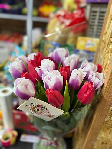 - Состав: тюльпаны двух оттенков — классические красные и бело‑лиловые (двухцветные), с насыщенно‑зелёной листвой.