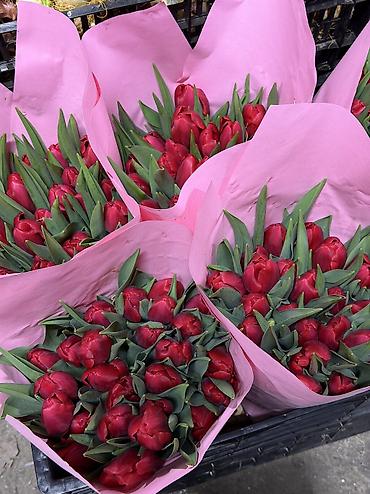 Тюльпаны оптом упакованные в крафт - Ассортимент цветов: белые, кремовые, розовые (несколько оттенков), лиловые/фиолетовые, красные, желтые, двухцветные. - Бутоны плотные, крупные, на крепких стеб...