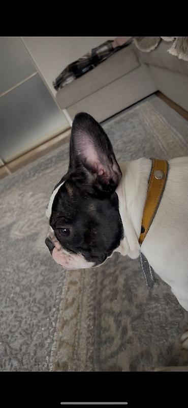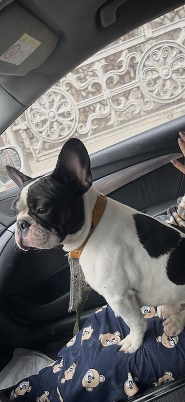 Французский бульдог, окрас черно‑белый (пегий). Крупная голова с выразительной маской, стоячие уши «летучая мышь», компактный мускулистый корпус, короткий хвост.