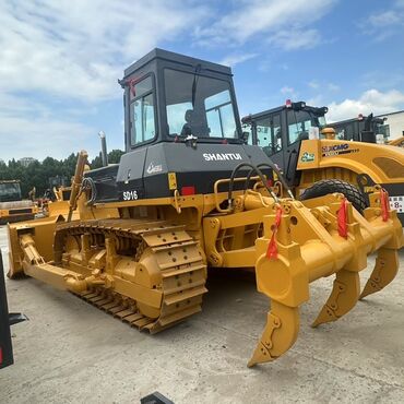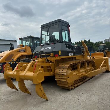 Бульдозер Shantui SD16 в характерной желто-черной расцветке, оснащенный отвалом спереди для перемещения материалов и рыхлителем с тремя зубьями сзади для подготовки грунта. Мощная гусеничная ходова...