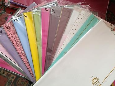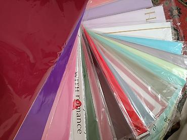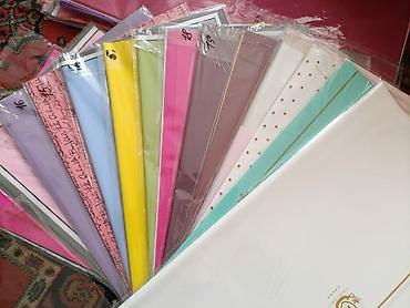 - Разнообразие фактур: двухсторонняя матовая пленка, полупрозрачные и глянцевые листы, бумага с печатью (надписи, горох, декоративные золотые линии), текстурированные листы «тканевый»/нетканый материал.