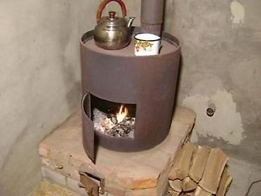 Печь-буржуйка коричневого цвета, выполненная из металла с
