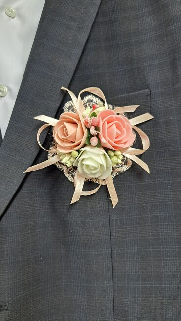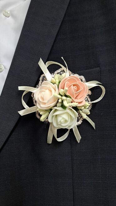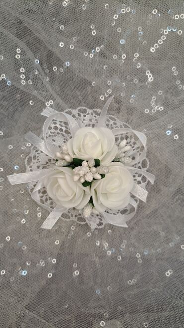 Миниатюрная бутоньерка с тремя белыми розочками, украшенными маленькими бусинами, аккуратно дополнена кружевной отделкой и тонкими лентами. Идеально подходит для украшения пиджака на свадьбу или другое торжественное мероприятие. Возможен повтор в любом нужном вам цвете. Также есть браслетики для подружек невесты.