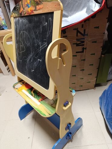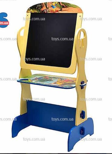 доска для рисования имеет две поверхности,грифельная (черная)для рисования мелками,белую -магнитную для рисования маркерами, фломастерами.